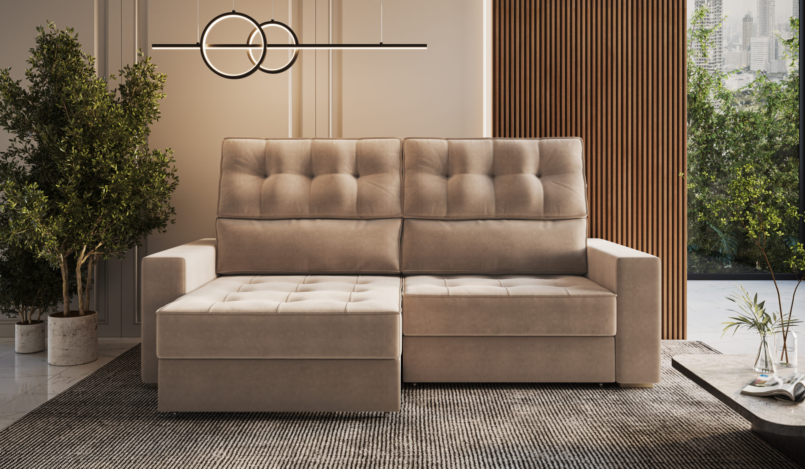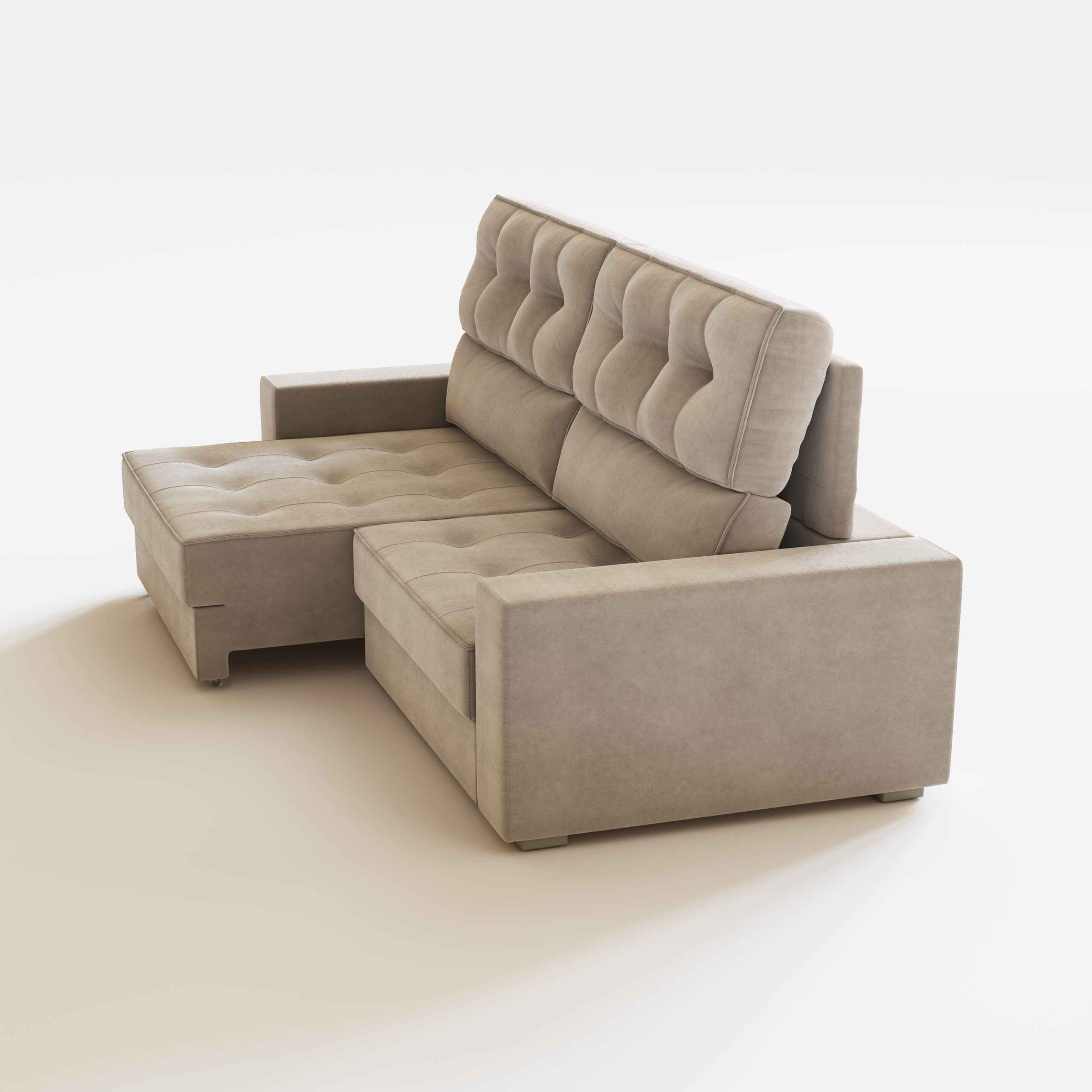 Encosto: Catraca com níveis de inclinação, enchimento com fibra siliconada nas almofadas. Abertura do assento 150cm.